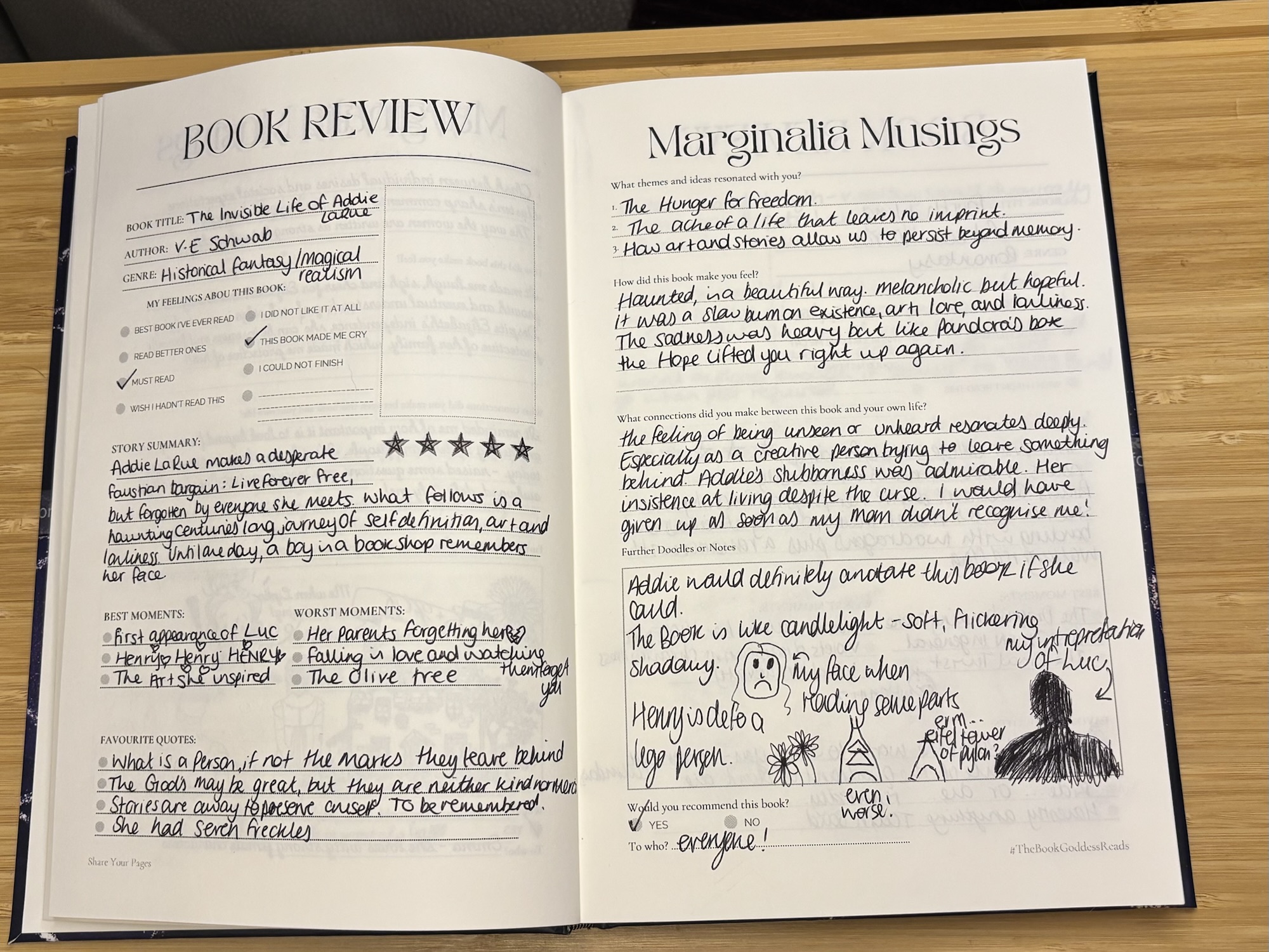 There’s something fitting about this book being remembered in fragments — Addie’s life, after all, is told in snapshots and echoes. Writing in the journal helped me hold on to those fleeting moments.